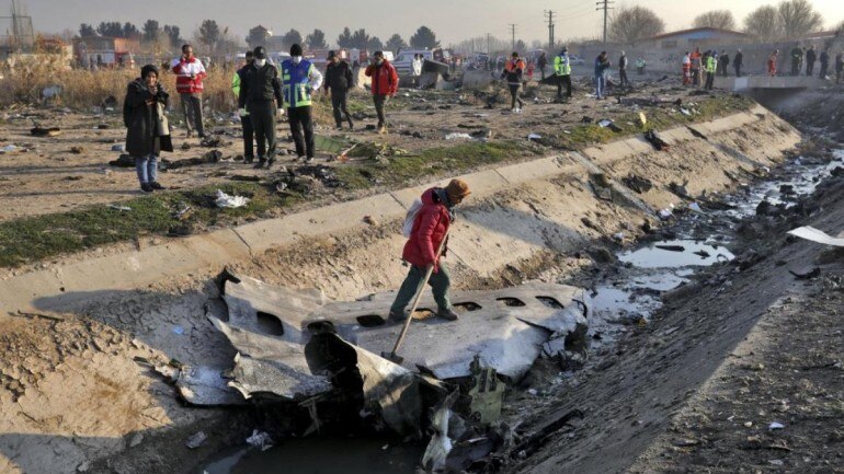 Rescue workers inspect the scene where a Ukrainian plane crashed in Tehran, Iran on January 8. (Photo: AP)